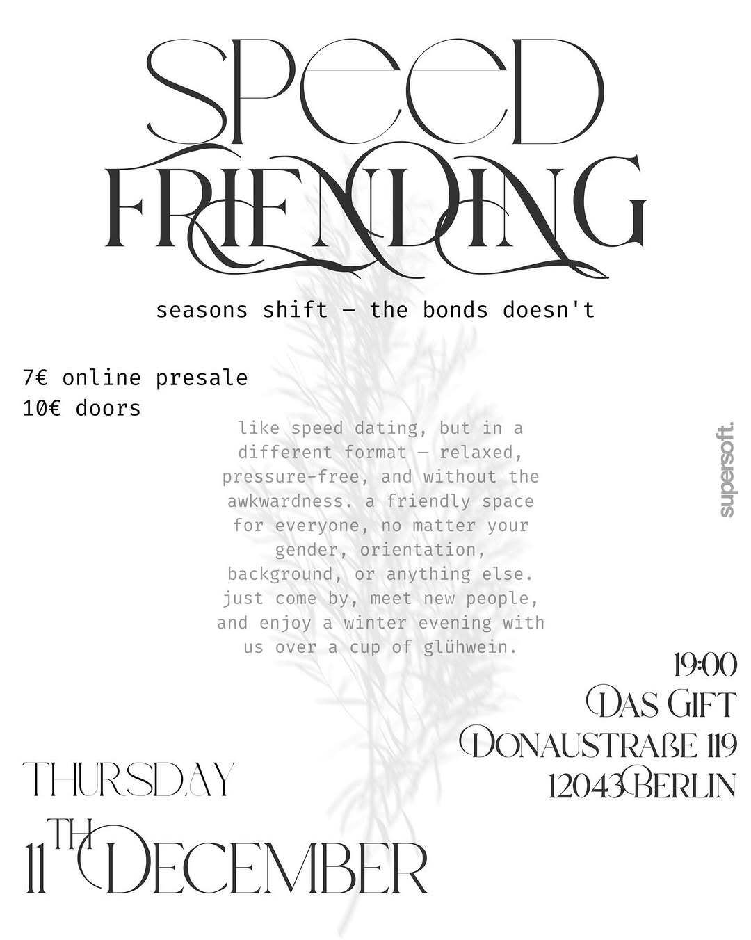 Winter can get lonely, but maybe the cure isn’t in yet another doomed situationship. Head to Das Gift on Thursday to try out speed friending: speed dating but with the goal of friendship. It’s relaxed and pressure-free, regardless of background. Grab a glühwein and bring a Santa hat for extra holiday vibes.