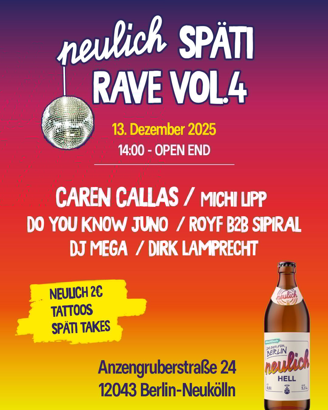 Not in club mood this weekend? Here’s something a bit more low-key. Celebrate the 50th birthday of the Anzen Späti with Neulich Bier, for €2 beer, tattoos, DJs, and vibes.