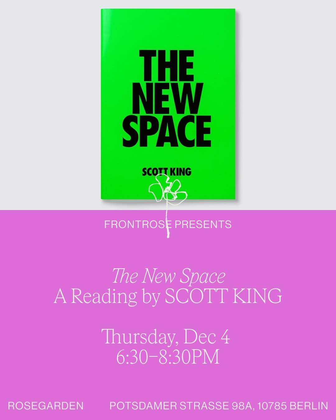 Frontrose welcomes you to Rosegarden for an evening with London-based art director and author Scott King, whose razor-sharp graphic language and satirical eye dissect the culture industry. His new limited-edition book, The New Space, explores the psychological grind of contemporary cultural labor, where relevance is contested, visibility is scarce, and an unseen force called Space Control shapes every move.
