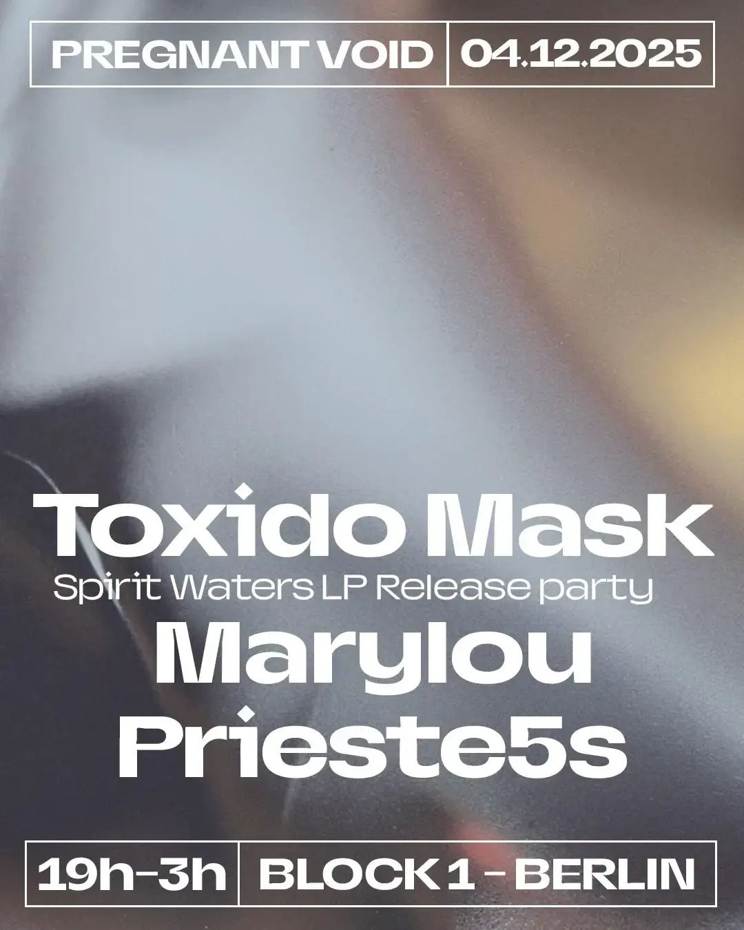 Pregnant Void presents the release of Spirit Waters, the debut ambient album by Toxido Mask. This new work is a flowing journey through mythical aquatic realms where evolving rhythms, subtle pulses, and immersive textures guide listeners from meditative stillness into deeper sonic currents. The evening opens with a full listening session and record presentation before shifting into live music and dance led by Marylou, known for her daring, psychedelic sets spanning experimental beats, jazz, dub, and jungle; Prieste5s, whose live-coded performances merge hypnotic techno, breakbeats, and bass-driven atmospheres; and Toxido Mask, a Berlin-based sound artist whose work moves between ambient immersion, experimental rhythm, and electronic drive. Dive in!