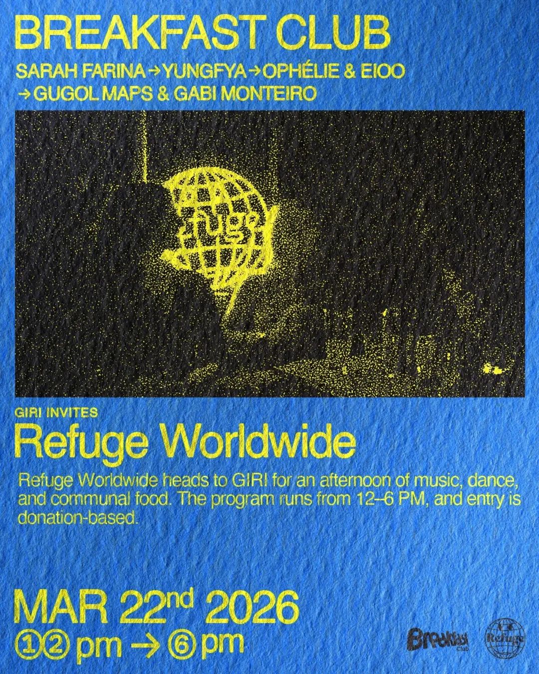 Refuge Worldwide makes a stop at Giri’s Breakfast Club this Sunday. The program includes music, dance, and communal food. Entry by donation.