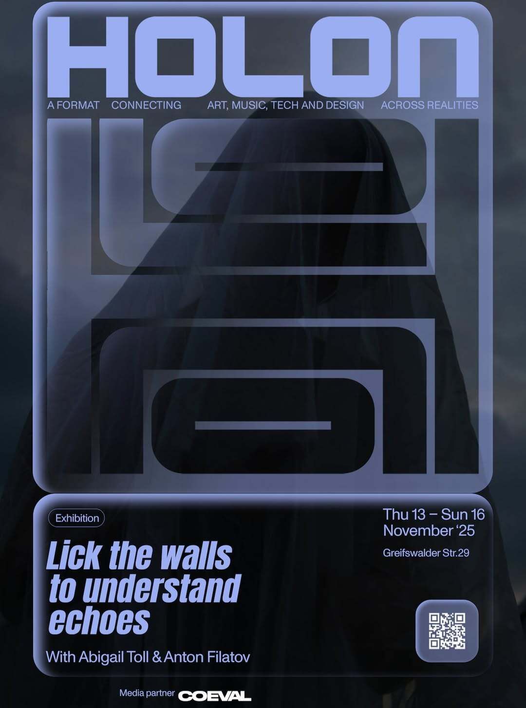 HOLON Berlin presents Lick the Walls to Understand Echoes: an immersive exhibition merging a psychoacoustic soundscape by Abigail Toll with interactive scenography and visuals by Anton Filatov. The audio-reactive installation expands on Toll’s conceptual vision for her forthcoming album Idol (Superpang), translating the physical and metaphysical resonance of sound into spatial experience. Lick the Walls to Understand Echoes reflects on the fading presence of symbols and rites in an age increasingly mediated by technology.