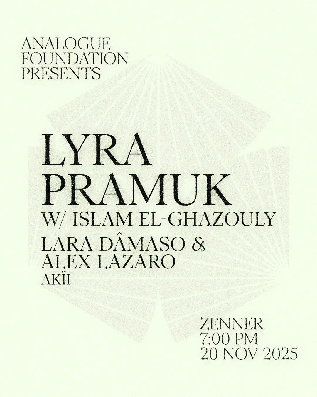 Analogue Foundation returns to Zenner Saal on Saturday, with the sixth edition of its intimate listening concert series. This edition features a special live performance by Lyra Pramuk, joined by Sufi whirling artist Islam El-Ghazouly, presenting transformational vocal compositions from Hymnal. Opening live, Lara Dâmaso & Alex Lazaro weave voice, movement, percussion, and resonance into a meditative shared space, followed by a dynamic DJ set from Akïï, blending experimental electronics and deconstructed club.