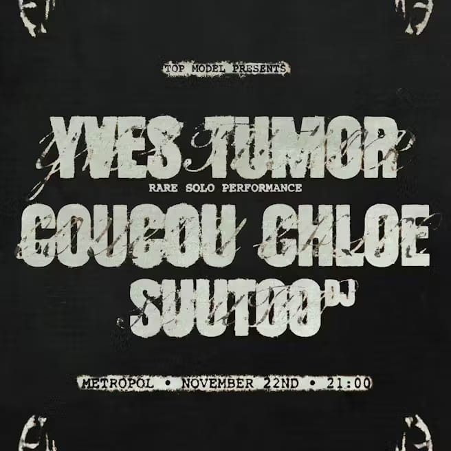Yves Tumor returns to Berlin with an exclusive solo live set, unleashing his unmistakable fusion of avant-garde pop and experimental electronics. Joined by COUCOU CHLOE and SUUTOO, the new Top Model Berlin series at the legendary Metropol creates a stage for bold sonic encounters and boundary-breaking performances.