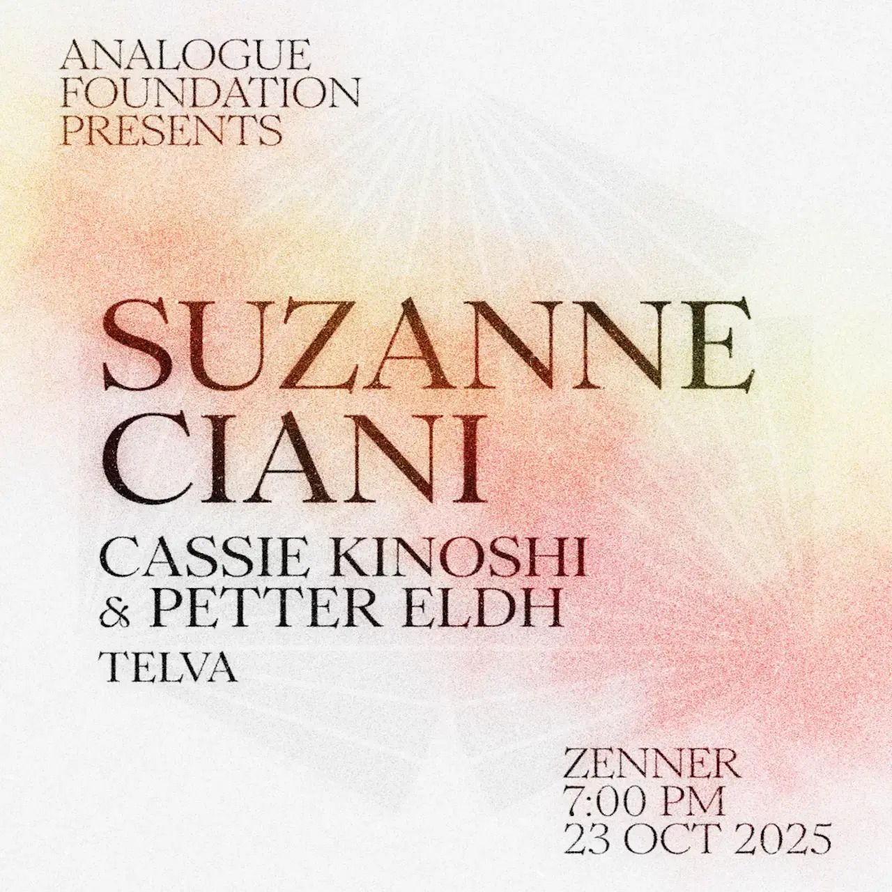 Analogue Foundation Berlin presents the fifth instalment of its acclaimed listening concert series at the historic Zenner Saal, transforming the venue into an immersive, close-listening environment where audiences can sit, move, or lie within the sound. The evening features an intimate performance by legendary synthesizer pioneer Suzanne Ciani, whose groundbreaking work with the Buchla synth and decades of innovation have shaped generations of electronic musicians.